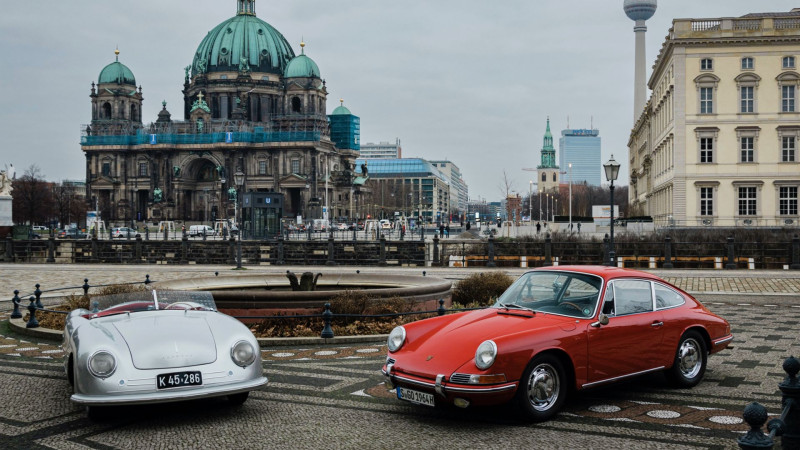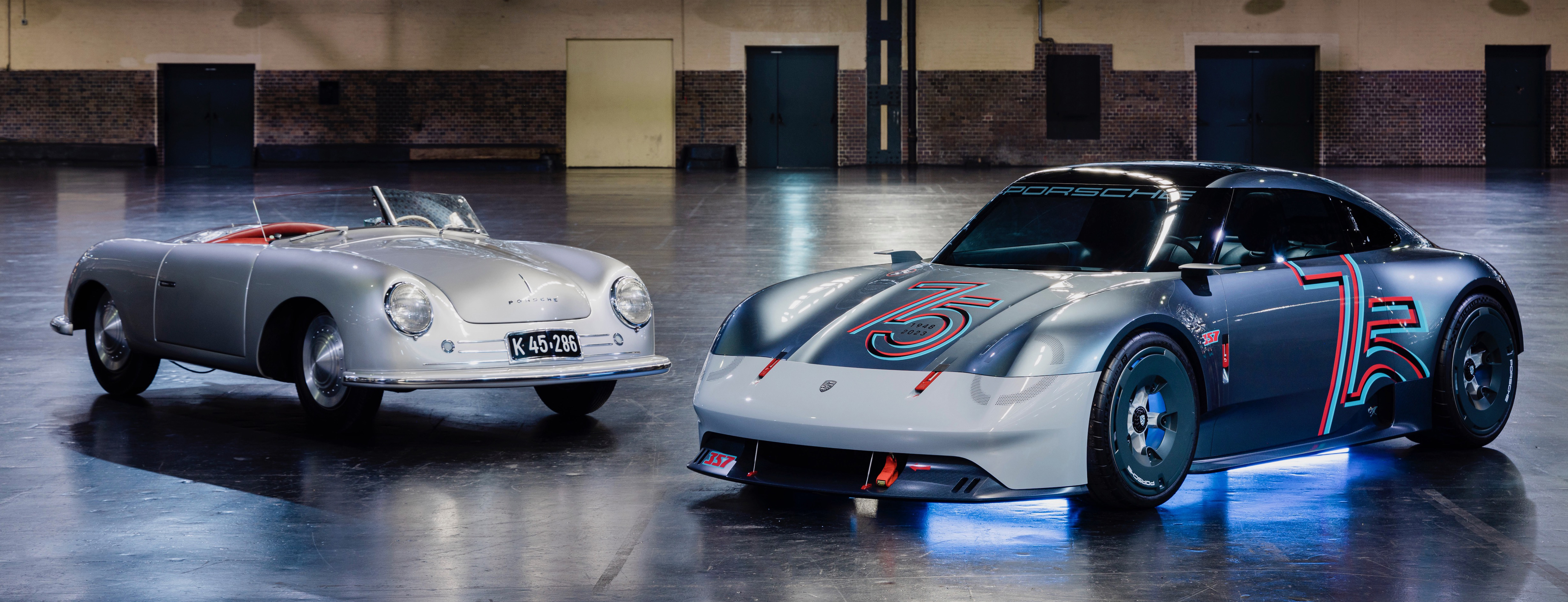 75 aastat Porsche sportautosid: Porsche 356 "No. 1" Roadster (1948) (vasakul), Porsche 911 (901 No. 57) (1963) (taga), Porsche Vision 357 (2023) (paremal)