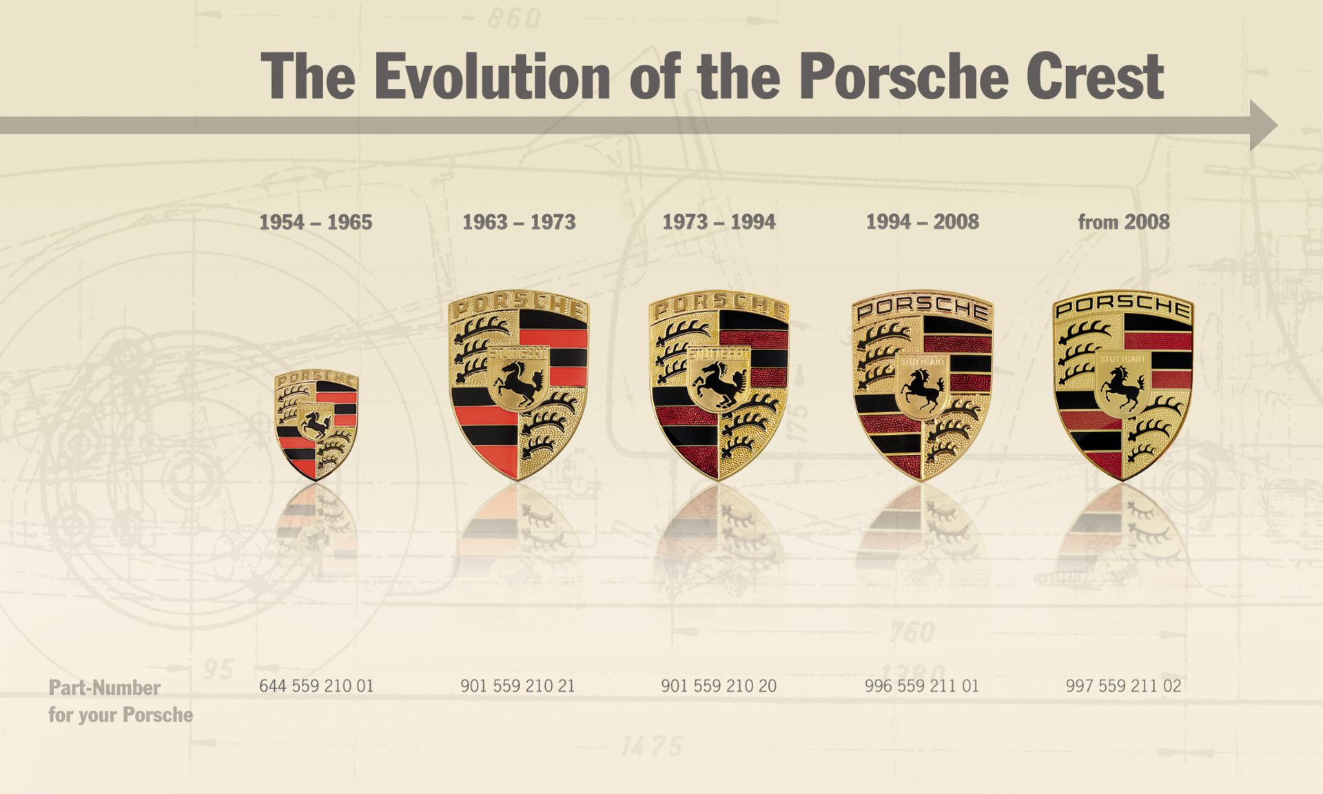 Tema ettepanek lükkaski masinavärgi tööle. 27. detsembril 1951 pani Ferry Porsche kirja järgmise mõtte: „Rooliratta keskmes kiri „Porsche“ ja Stuttgardi vapp või midagi sarnast.“ Saksamaale naasnult palkas Porsche disainer Franz Xaver Reimspiessi, kelle ülesandeks sai kavandada kaubamärk, mis peegeldaks ettevõtte juuri ning tema toodete kvaliteeti ja dünaamilisust.