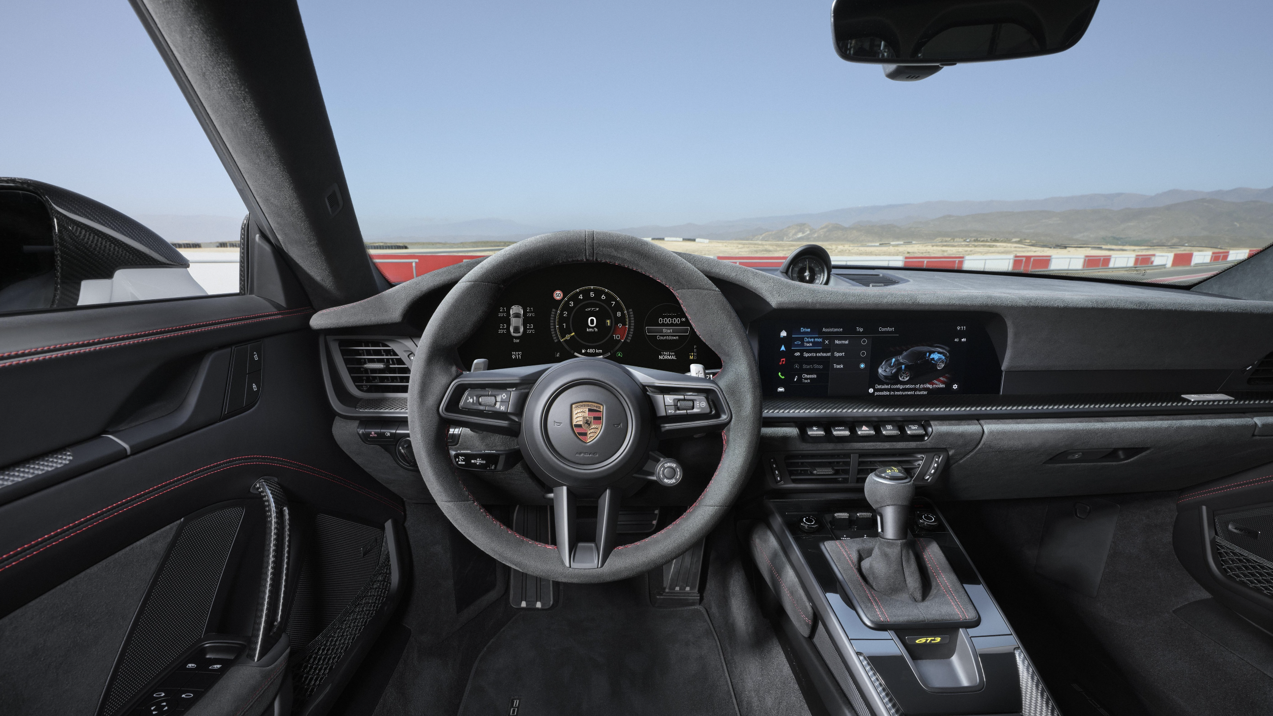 Uue 911 GT3 must kahe istmega standardsisustus põhineb praeguse 911 mudelitel. Erinevalt Carrera mudelitest ei käivitata 911 GT3 mootorit aga mitte nupule vajutades, vaid endiselt pööratavast süütelülitist. Lisana saadaolev turvapuur demonstreerib võidusõidulähedust. Digitaalne näidikupaneel toetab juhti selgelt struktureeritud kuva- ja juhtimiskontseptsiooniga. Tänu kontrasttoonides värvilahendusele on tahhomeetri ja stopperi näit hetkega loetavad. Ekraani ringrajarežiim (Track Screen) vähendab näidikute hulka ning kuvab tahhomeetrist vasakul ja paremal ainult kõige olulisemaid andmeid rehvide, õli, vee ja kütuse kohta, ning näitab juhile vilgutusega ka optimaalset käiguvahetushetke. Soovi korral saab tahhomeetri skaalat pöörata nii, et maksimumpöörete näit 9000 p/min oleks ülal keskel.