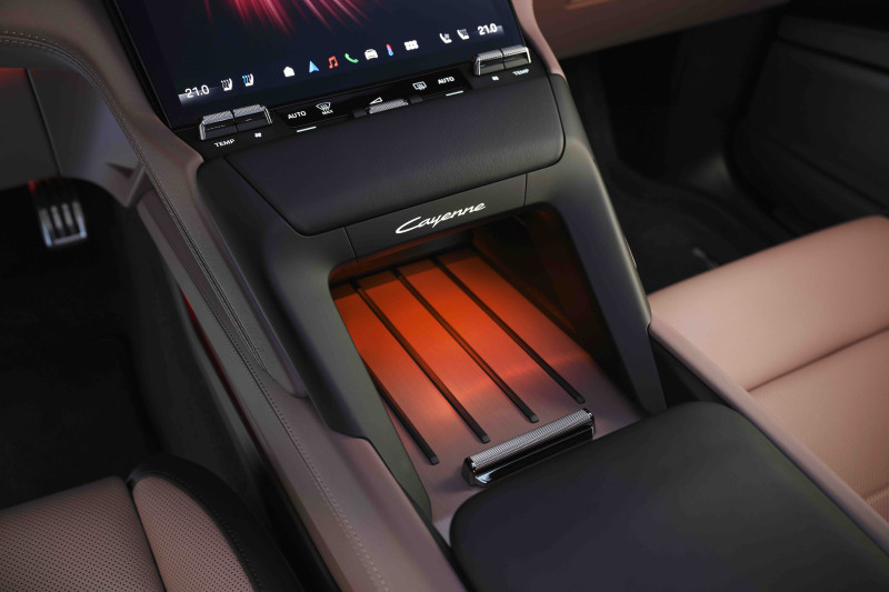 Digiteerimise vallas viib Cayenne Electric sõidukogemuse uuele tasemele. Värskelt väljatöötatud Porsche Driver Experience’i südames on uus Flow Display – elegantselt nõgusa pinnaga OLED-ekraan, mis sulab harmooniliselt kokku keskkonsooliga ning võimaldab teha selge vahe ekraani ja juhtpindade vahele. Seda täiendab täisdigitaalne näidikupaneel 14,25-tollise OLED-ekraaniga ja soovi korral ka 14,9-tolline ekraan eesmise kaasreisija ees. Need kokku moodustavad suurema ekraanipikka kui üheski teises Porsches kunagi nähtud. Esimest korda on Cayenne’ile saadaval ka liitreaalsusega esiklaasinäidik, mille kujutise suurus vastab 87-tollisele ekraanile kümne meetri kaugusel auto ees. Kõik ekraanid sulanduvad harmooniliselt interjööri kujundusse. Kõige sagedamini kasutatavad nupud ja lülitid, näiteks kliimaseadme ja helitugevuse omad, on seevastu analoogtehnika. Lisaks töötati välja selline käetugi, mis võimaldab juhil kasutada digitaalseid ja analoogjuhtseadiseid ergonoomiliselt – isegi eriti dünaamilistes sõiduoludes.