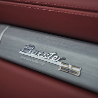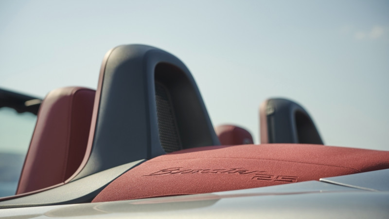 Algupärase mudeli joont hoides saab erimudelgi bordoopunase nahksisu ja punasest tekstiilmaterjalist pehme katuse. Viimast ehib ka reljeefne kiri „Boxster 25“. Interjööri ja katust saab soovi korral tellida ka mustana. Uue mudeli laiendatud põhivarustusse kuuluvad muuhulgas alumiiniumdetailidega interjööripakett, 14 suunas elektriliselt reguleeritavad sportistmed, ukselävekatted kirjaga „Boxster 25“ ning multifunktsionaalne, soojenduse ja nahkkattega GT-sportrool.
